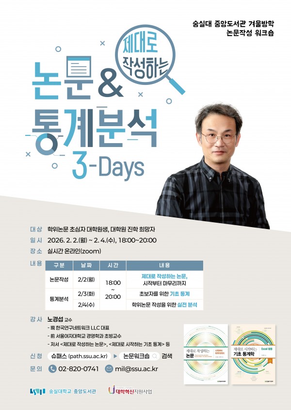 숭실대학교 중앙도서관에서 겨울방학 논문 심화 워크숍을 다음과 같이 개최하니 많은 관심과 참여 바랍니다.